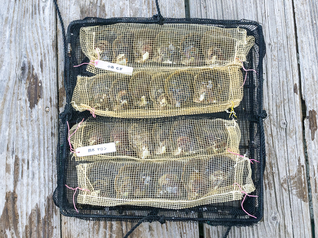 受け止めるために専用のカゴで養生を行っています。 貝から出された〈虹守核〉は再度、新しいアコヤガイに核入れをし、複数枚の母貝をお作りします。